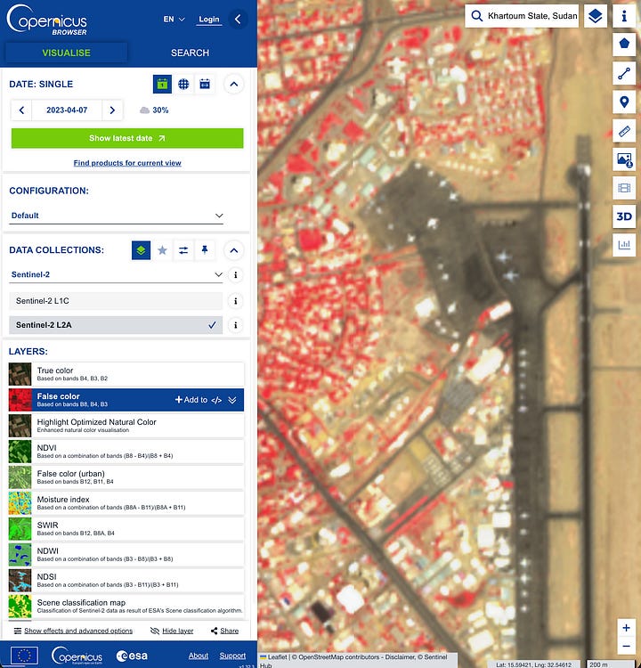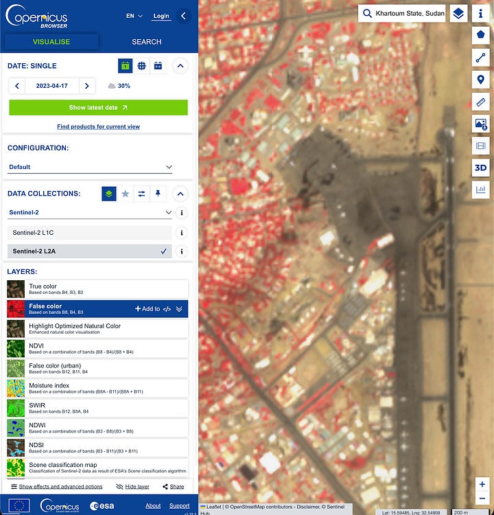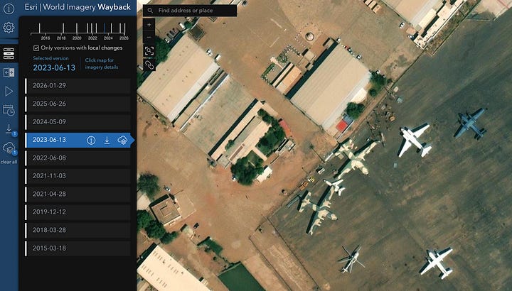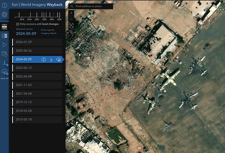 Any single satellite platform gives you a picture. Stacking multiple sources gives you evidence. The goal is to turn a finding (”something changed here”) into a defensible timeline with layered evidence: high-level history, sensor-confirmed change signals, and crisp visual before/after. In the example below, we’re going to walk through this using the example of change identified in 2023 in Khartoum International Airport.