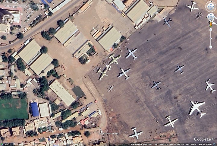 In this case, planes and buildings were destroyed on the tarmac in Sudan’s Khartoum around April 2023.