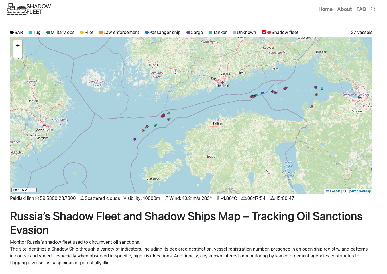 A clean, investigator-friendly map tracking Russia’s shadow fleet across the Baltic Sea, North Sea, Western Europe, Mediterranean, and Suez Canal. Vessels are flagged via behavioural and registry indicators: destinations, IMO patterns, suspicious navigation in high-risk locations (underwater cables, pipelines), and law enforcement interest. Built for quick triage rather than deep attribution.