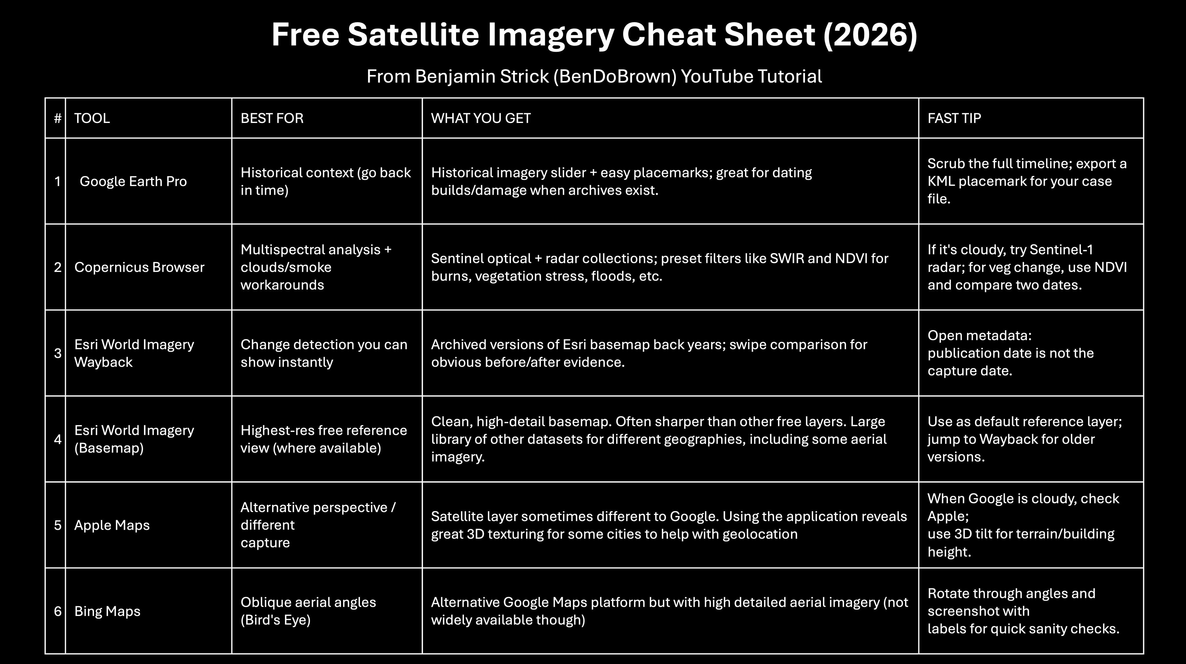 NASA Worldview: Near real-time visualisation of a wide range of Earth observation layers. Good for rapid situational context (fires, smoke, dust) and first-pass timing cues. Watch-out: Not a replacement for hi-res evidence. It’s context and leads.