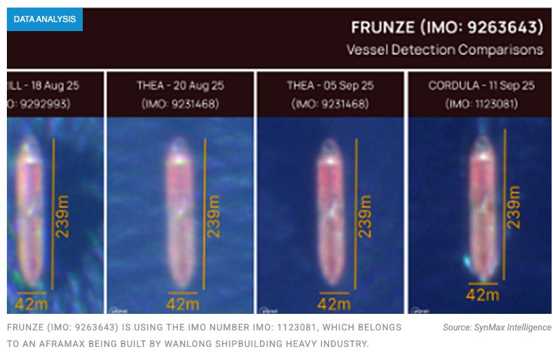 Sanctioned tankers are now stealing identities of ships still under construction. Lloyd’s List and SynMax Intelligence document the first known case: the sanctioned aframax (medium-sized oil tanker) Frunze transmitting using the IMO number of an aframax currently being built at Wanlong Shipbuilding in China. Unlike “zombie” tankers using scrapped vessel IMOs, newbuilds offer cleaner deception with no operational history or AIS tracks to conflict with.