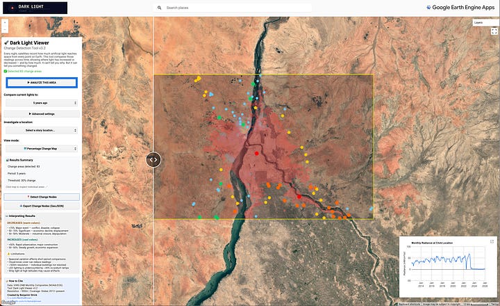 The Technical Teardown covers the Dark Light Viewer, a free browser tool I built for tracking infrastructure change using NASA night-light data. A reminder that when some sources dry up, getting creative with under-utilised sources can open up new avenues for research.