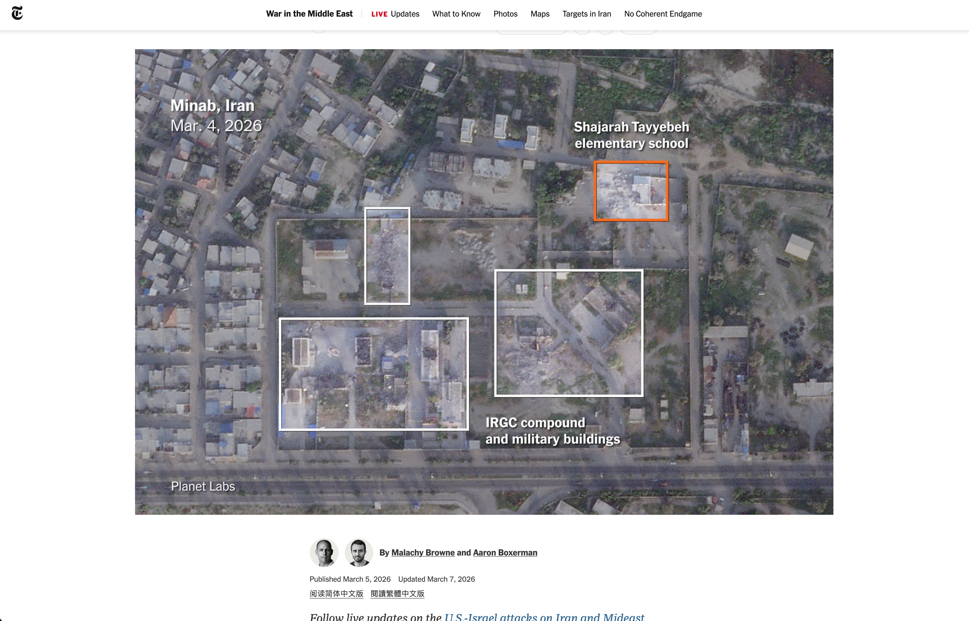 NYT Visual Investigations, BBC Verify, Channel 4 FactCheck, CBC News, and Human Rights Watch all worked from the same Planet Labs imagery. All found the same pattern: precision strikes on multiple structures across the IRGC naval compound, including the school. All confirmed via historical satellite record that the school had been walled off from the military compound since 2016.