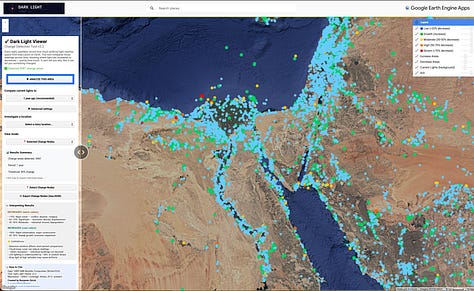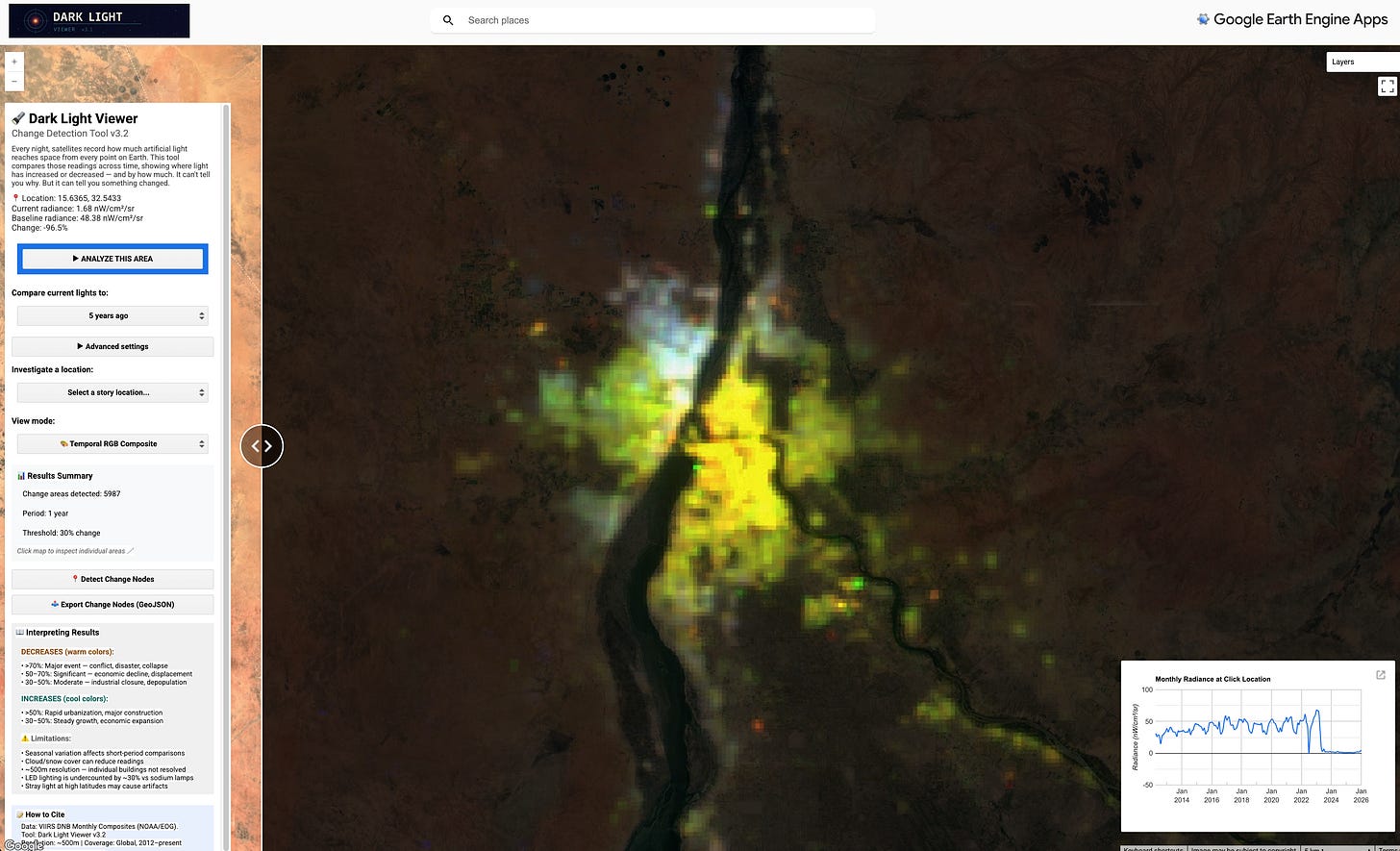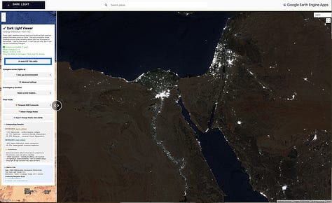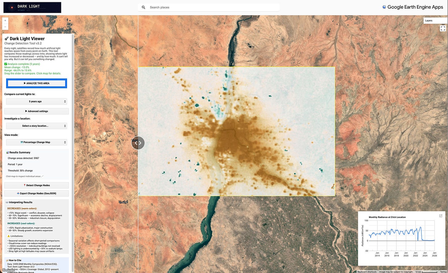 The Dark Light Viewer is a free browser-based tool I built on Google Earth Engine that uses NASA’s VIIRS night-light data to show where human-generated light has increased or decreased over time.