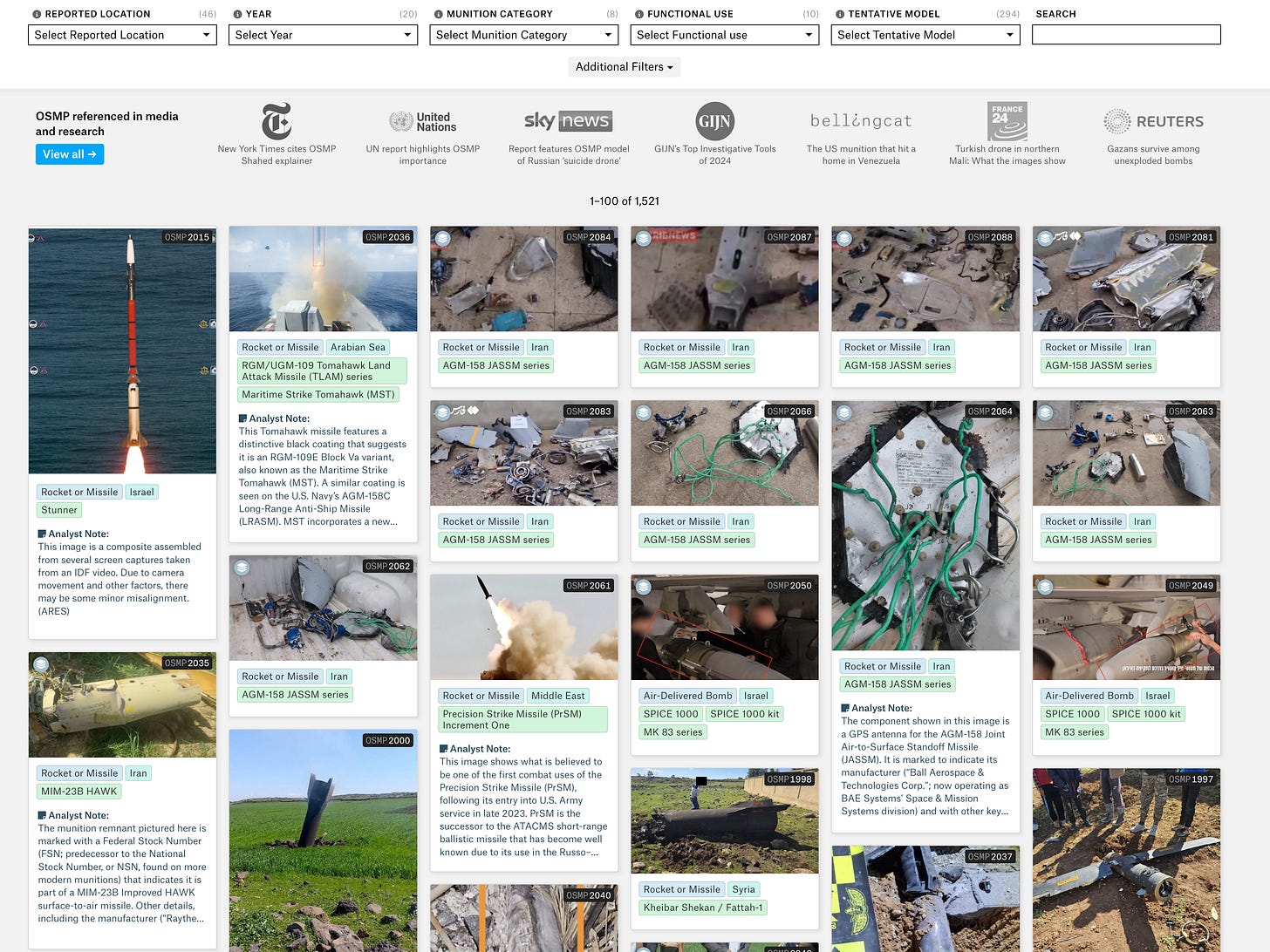 OSMP has continued updating its Iran War 2026 collection and remains one of the cleanest public reference libraries for weapons identification from open material. It works best as a companion to reverse image search and debris analysis, not as a substitute for them.